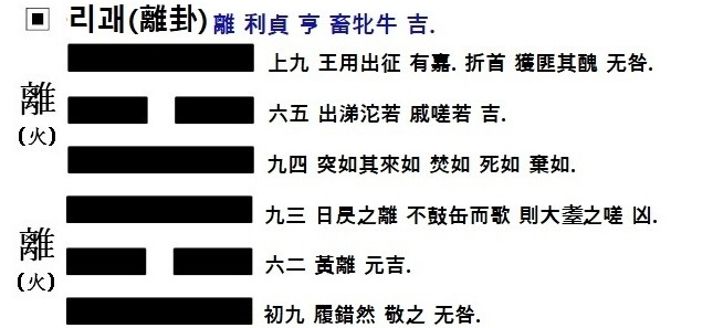 【정이천(程伊川) 전(傳)】 {괘의 재질로 말하였다. 위‧아래가 모두 리괘(離☲)인 것이 밝음을 거듭함이고, 이효와 오효가 모두 중정(中正)에 처함이 바름에 붙은 것이다. 군신과 상하가 모두 밝은 덕이 있고 중정에 있으니, 천하를 교화하여 문명한 풍속을 이룰 수 있다.}