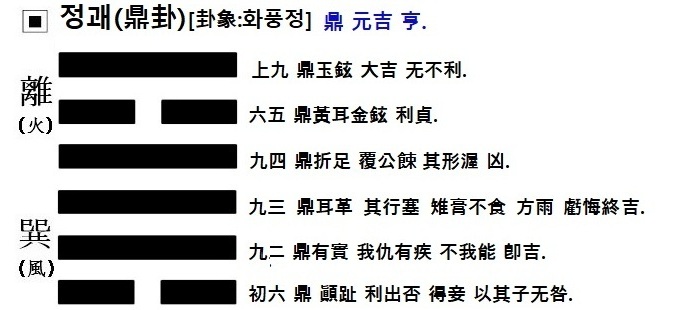 【程伊川 傳】(卦之爲鼎, 取鼎之象也, 鼎之爲器, 法卦之象也. 有象而後有器, 卦復用器而爲義也, 鼎大器也重寶也, 故其制作形模, 法象尤嚴. 鼎之名正也. 古人訓方, 方實正也 .以形言, 則耳對植於上, 足分峙於下, 周圓內外, 高卑厚薄, 莫不有法, 而至正, 至正然後, 成安重之象, 故鼎者, 法象之器, 卦之爲鼎, 以其象也.)