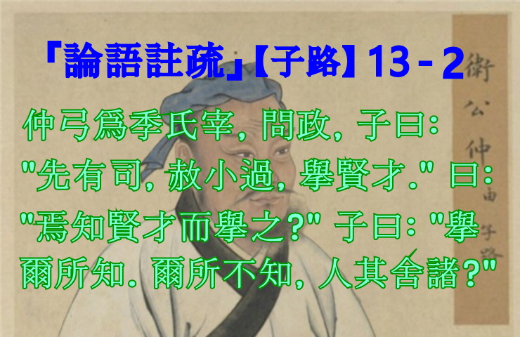 仲弓為季氏宰,問政。子曰:「先有司,(王曰:「言為政當先任有司而後責其事。」 )赦小過,舉賢才。」曰:「焉知賢才而舉之?」曰:「舉爾所知,爾所不知,人其舍諸?」(孔曰:「女所不知者,人將自舉其所知,則賢才無遺。」)