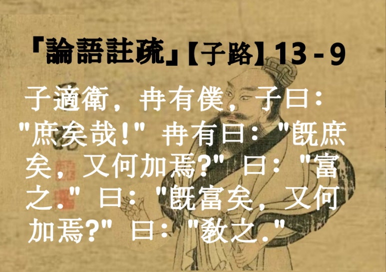 子適衛,冉有僕。(孔曰:「孔子之衛,冉有禦。」 )子曰:「庶矣哉!」(孔曰:「 庶,衆也。言衛人衆多。」 )冉有曰:「既庶矣,又何加焉?」曰:「富之。」 曰:「既富矣,又何加焉?」曰:「教之。」