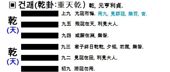 높이 올라간 용은 후회가 있다는 말은 가득 찬 것은 오래 할 수 없음이다. 용구(用九)란 말은 하늘의 덕(德)은 우두머리가 됨이 불가함이다.