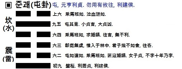 【朱熹 本義】(屯,張倫反。震坎,皆三畫卦之名。震,一陽動于二陰之下,故其德為動,其象為雷。坎,一陽陷於二陰之間,故其德為陷、為險,其象為雲、為雨、為水。屯,六畫卦之名也,難也,物始生而未通之意。故其為字,象屮穿地始出而未申也。其卦以震遇坎,乾、坤始交而遇險陷,故其名為屯。震動在下,坎險在上,是能動乎險中。能動雖可以亨,而在險,則宜守正,而未可遽進。故筮得之者,其占為大亨而利於正,但未可遽有所往耳。又,初九,陽居陰下,而為成卦之主,是能以賢下人,得民而可君之象。故筮立君者,遇之則吉也。)