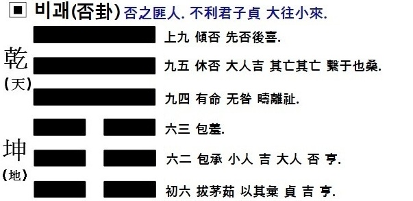 비(否)는 바른 사람이 아니다. 군자의 곧음에는 이롭지 않으니, 큰 것<외괘>은 가고 작은 것<내괘>이 온다.