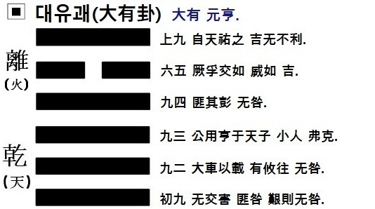 【주희(朱熹) 본의(本義)】 {대유(大有)는 가지고 있는 바가 큰 것이다. 리괘(離卦)가 건괘(乾卦) 위에 있으니, 불이 하늘 위에 있어서 비추지 않는 곳이 없다. 또 육오는 하나의 음이 존귀함에 있으면서 알맞음 얻었고, 다섯 양들이 호응을 하기 때문에 대유괘가 된다. 건괘는 굳세고 리괘는 밝으며, 존귀함에 거주하면서 하늘에 호응하므로 형통함의 도(道)가 있으니, 점을 치는 자가 이러한 덕(德)을 가지고 있다면 크게 착하면서 형통하다.}
