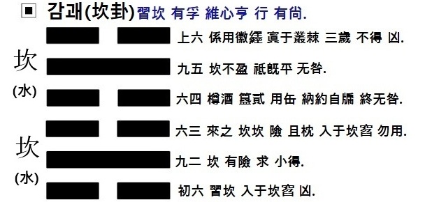 【주희(朱熹) 본의(本義)】 {‘습(習)’은 거듭 익힘이고, ‘감(坎)’은 험하여 빠짐이다. 그 상(象)은 물이니, 양이 가운데 음에 빠져서 밖은 비고 가운데는 채워졌다. 이 감괘(䷜)는 위와 아래가 다 감(☵)이니, 이것이 거듭된 험함이고 가운데가 채워있음은 정성이 있어서 마음이 형통한 상(象)이다. 이로써 행하면 반드시 공이 있을 것이므로 그 점(占)이 이와 같다.}