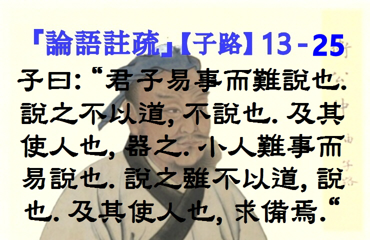◆ 13 - 25) 子曰: "君子易事而難說也. 說之不以道, 不說也. 及其使人也, 器之. 小人難事而易說也. 說之雖不以道, 說也. 及其使人也, 求備焉."