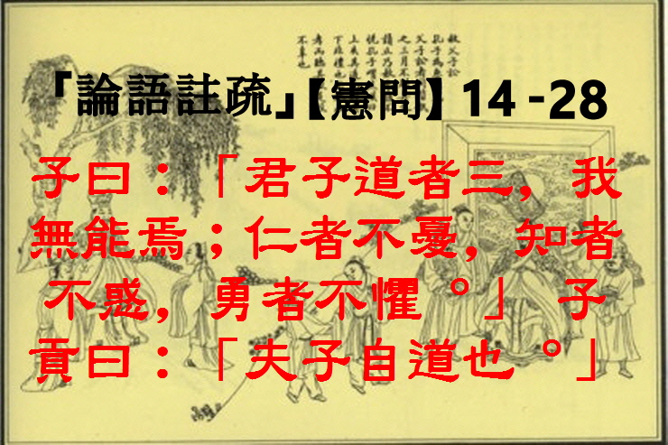 ◆ 14 - 28) 子曰:「君子道者三,我無能焉;仁者不憂,知者不惑,勇者不懼。」 子貢曰:「夫子自道也。」