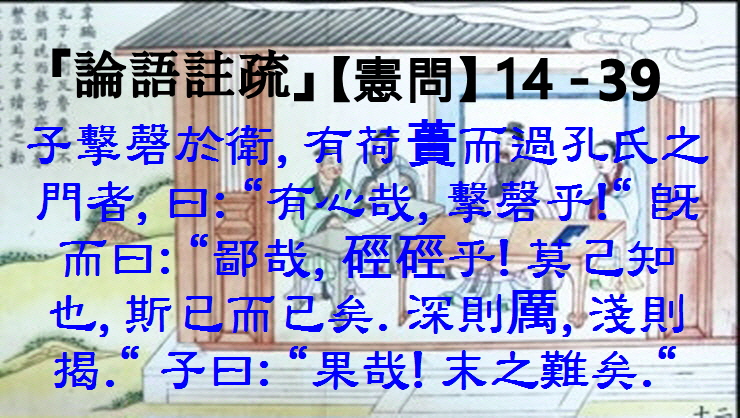 【集解】 子擊磬於衛,有荷蕢而過孔氏之門者,曰:「有心哉!,擊磬乎?」(蕢,草器也。有心,謂契契然。◎何晏 注: “괴(蕢: 삼태기 궤)”는 풀로 만든 그릇이다. "유심(有心)"이란 맺힌 것처럼 근심함을 말한다.)既而曰:「鄙哉,硜硜乎? 莫己知也,斯己而已矣。(此硜硜者,徒信己而已,言亦無益。◎何晏 注: 이 갱갱(硜硜)이라고 한 것은, 단지 자기(己≒孔子)를 믿을 뿐이며 또한 <세상에> 보탬이 없다는 말이다.)深則厲,淺則揭。」(包曰:「以衣涉水為厲。揭,揭衣也。言隨世以行己,若過水必以濟,知其不可則當不為。」 ◎포함이 말하였다:옷을 입고서 물을 건너는 것을 ‘려(厲: 갈 려)'라고 하고, “게(揭: 높이 들 게)”는 옷을 걷는 것이다. 세상을 따라서 자기를 행함인데, 만약 물을 건너야 하면 반드시 건너야 하고 그것이 할 수 없음을 알면 마땅히 하지 않아야 한다는 말이다.)子曰:「果哉,末之難矣!」(未知己志而便譏己,所以為果。末,無也。無難者,以其不能解己之道。◎何注: 당신(己≒孔子)의 뜻을 알지 못하면서 당신(己≒孔子)을 비웃었기에, 그로써 과감하다고 한 것이다. “말(末)”는 없음이며, 어려울 게 없겠다고 하신 것은 그가 당신(己≒孔子)의 도(道)를 이해할 수 없기 때문이다.)