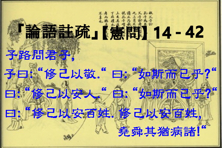 ◆ 14 - 42) 子路問君子, 子曰: "修己以敬." 曰: "如斯而已乎?" 曰: "修己以安人." 曰: "如斯而已乎?" 曰: "修己以安百姓. 修己以安百姓, 堯舜其猶病諸!"