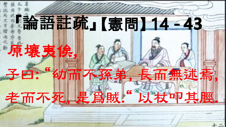 ◆ 14 - 43) 原壤夷俟, 子曰: "幼而不孫弟, 長而無述焉, 老而不死, 是爲賊." 以杖叩其脛.